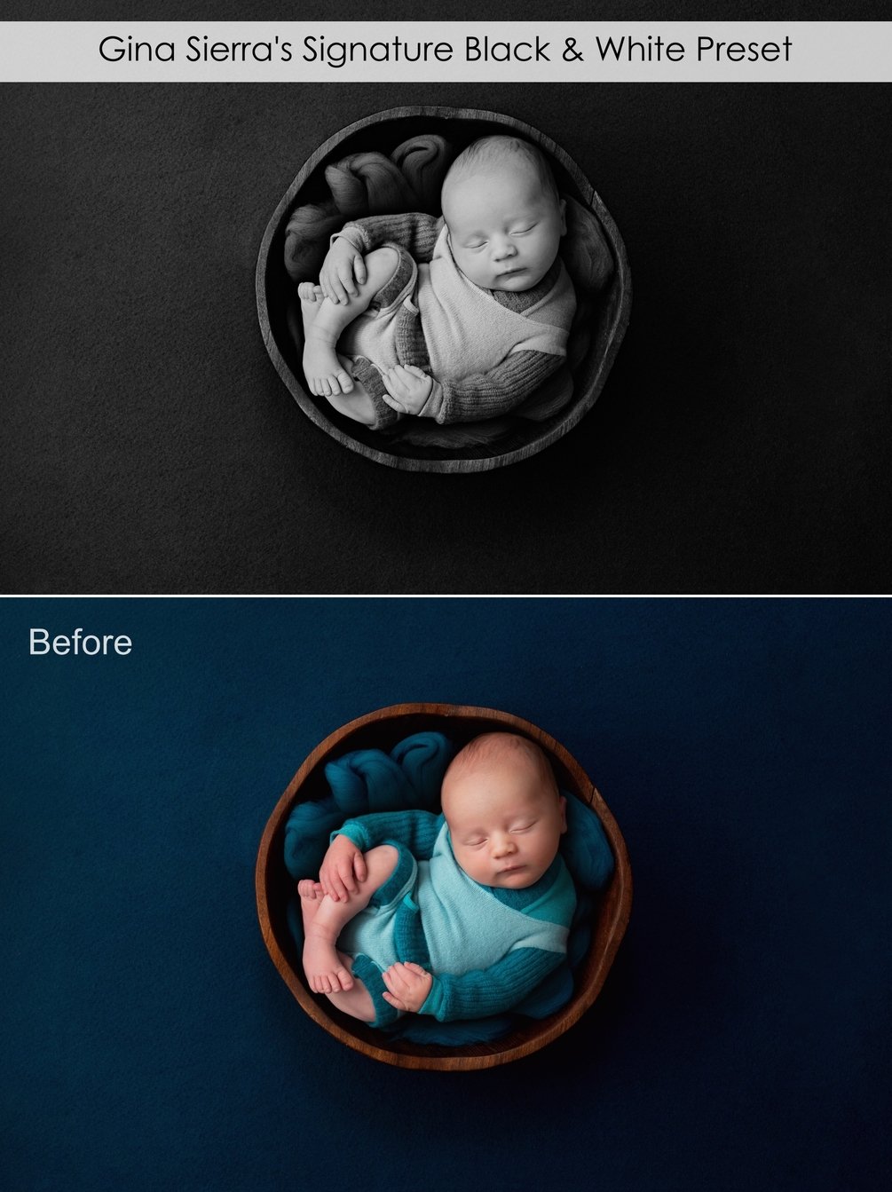 Gina Sierra's Signature Black & White Edit features crisp details, bright highlights and deep blacks, all coming together for a classic and timeless black and white image. This preset is meant to be used on top of a fully edited jpeg. This means you should edit your photo first (using a preset or your own custom editing), then save it as a finished file. Then, use my Signature Black & White Preset on the color photo you just finished. Voilà! A crisp, timeless black and white image is just a tap away!