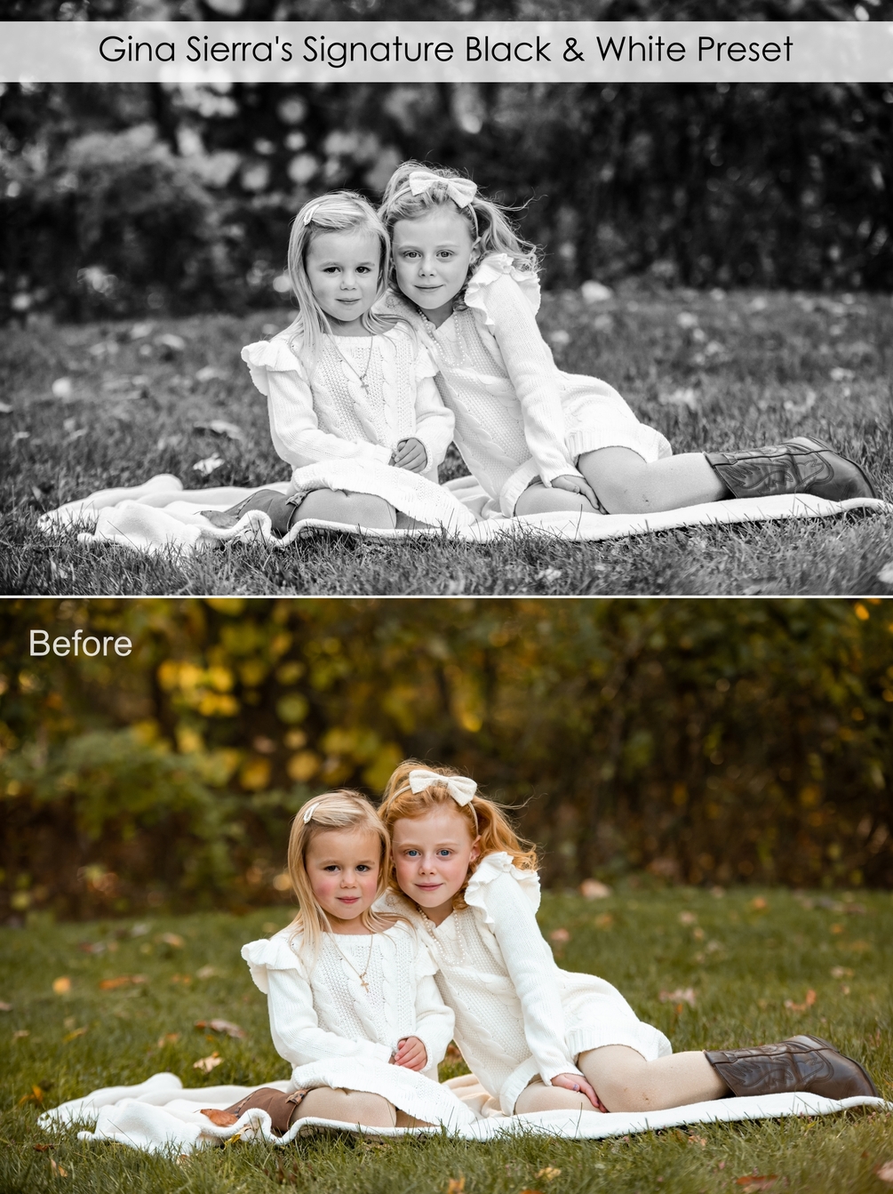 Gina Sierra's Signature Black & White Edit features crisp details, bright highlights and deep blacks, all coming together for a classic and timeless black and white image. This preset is meant to be used on top of a fully edited jpeg. This means you should edit your photo first (using a preset or your own custom editing), then save it as a finished file. Then, use my Signature Black & White Preset on the color photo you just finished. Voilà! A crisp, timeless black and white image is just a tap away!